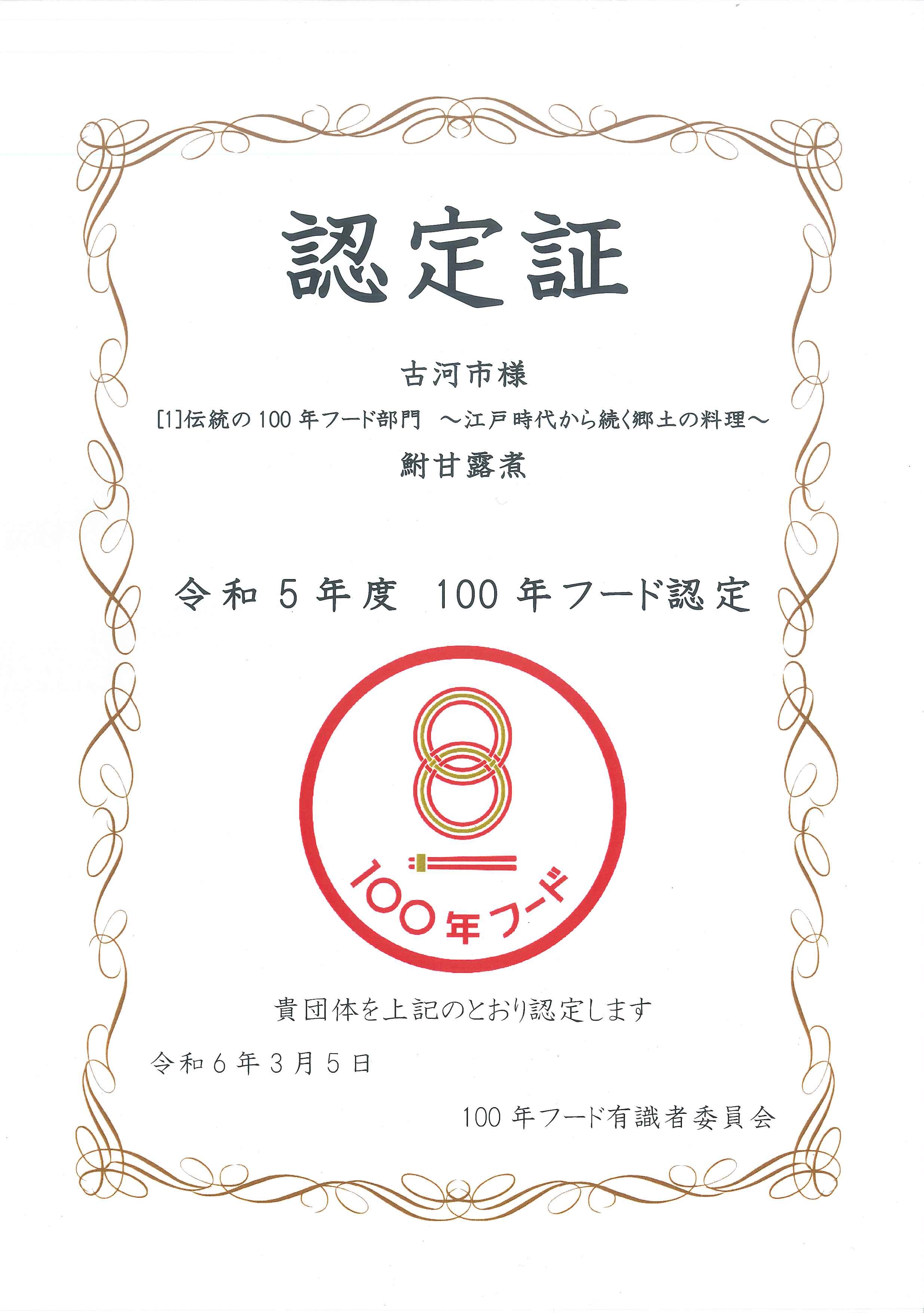 令和5年に晃陽学園が発起人となり推薦、提案してきた古河市の『鮒甘露煮』が、文化庁が推進する『100年フード』(伝統の100年フード部門)に認定されました。