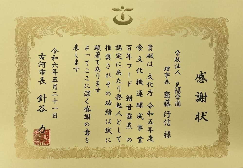この功績により、令和6年5月、晃陽学園は古河市より感謝状をいただきました。