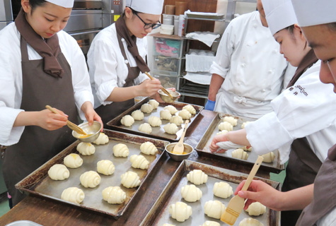 徹底的にお菓子とパンを学ぶ1年!毎日の授業で製菓製パンの知識・技術を総合的に学び、校内併設の「ベーカリー ミーモ」研修で実践を学ぶ事が出来ます。 |
